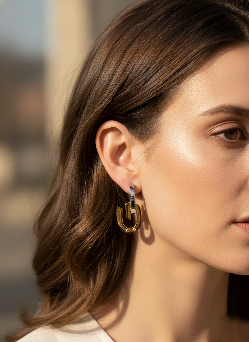Add a modern twist to your everyday style with these interlocked oval-shaped earrings. The gold and silver tones balance each other perfectly, making them a unique and eye-catching piece. Great for both casual wear and dressy evenings.